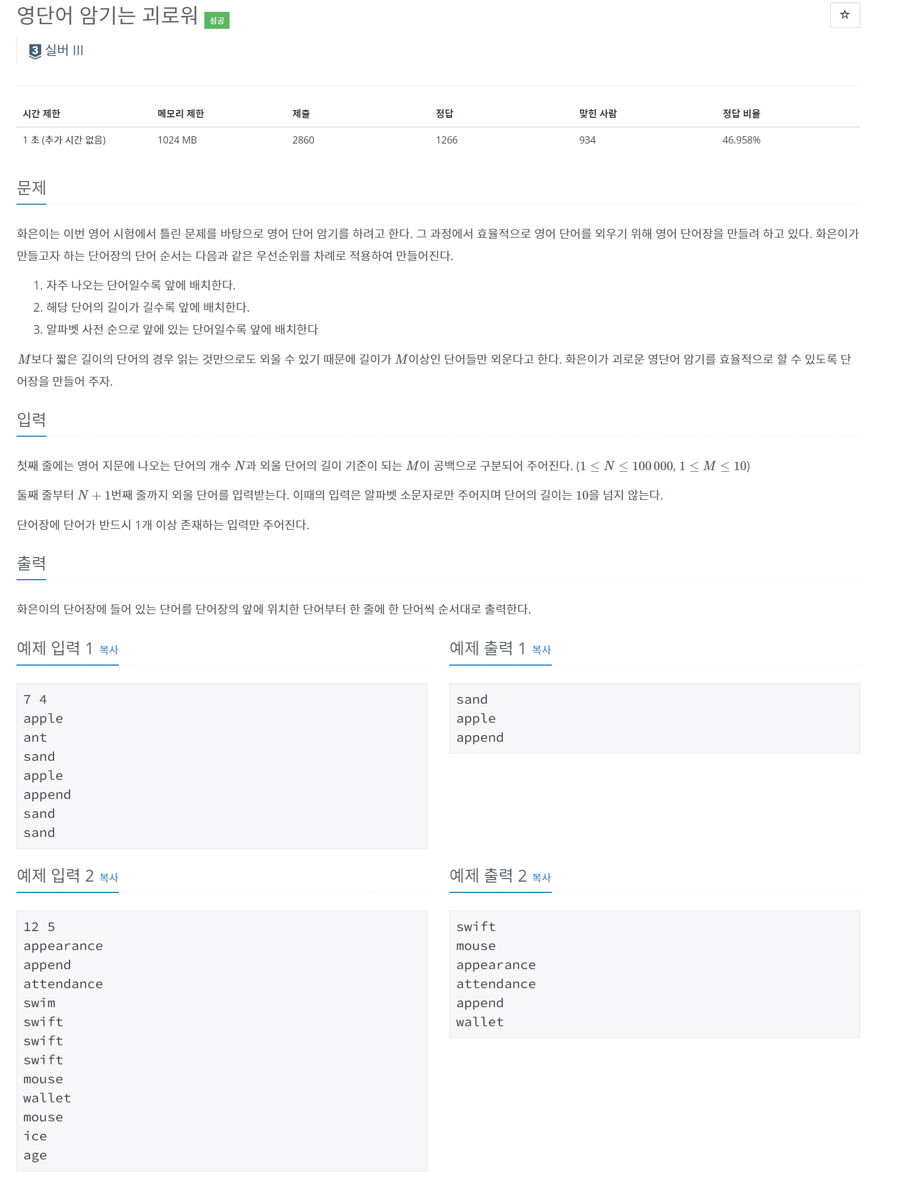 첫째 줄에는 영어 지문에 나오는 단어의 개수 $N$과 외울 단어의 길이 기준이 되는 $M$이 공백으로 구분되어 주어진다. ($1 \leq N \leq 100\,000$, $1 \leq M \leq 10$) 둘째 줄부터 $N+1$번째 줄까지 외울 단