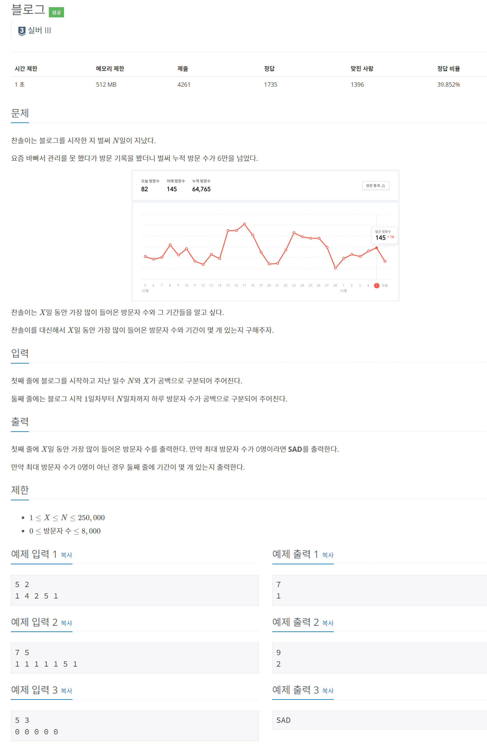 https://www.acmicpc.net/problem/21921 21921번: 블로그 첫째 줄에 $X$일 동안 가장 많이 들어온 방문자 수를 출력한다. 만약 최대 방문자 수가 0명이라면 SAD를 출력한다. 만약 최대 방문자 수가 0명이 아닌 경