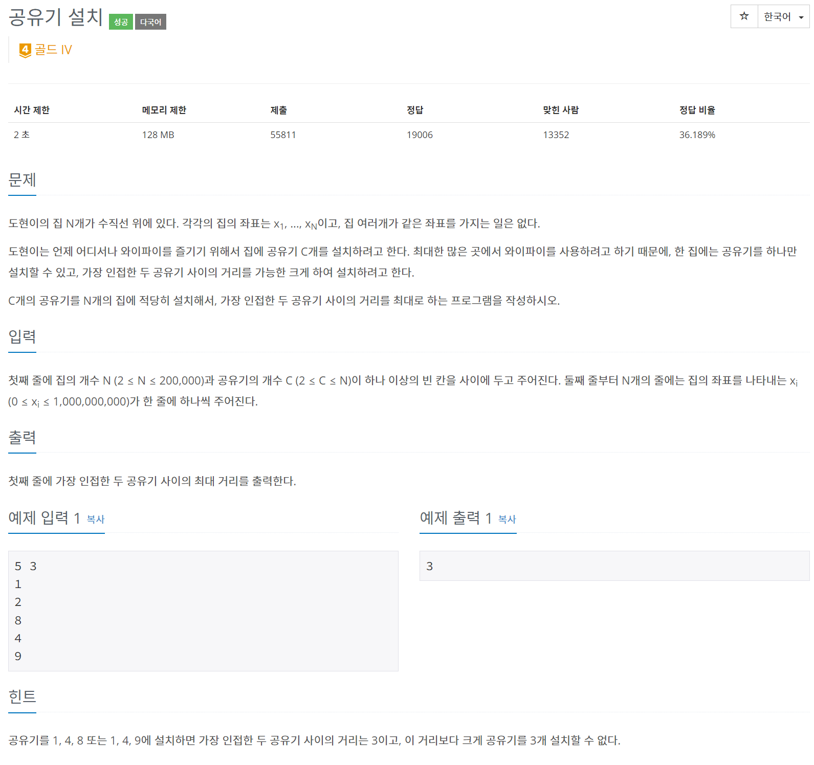 int possibleCnt=isPossible(mid); //mid가 최소거리일때 설치 가능한 공유기 개수