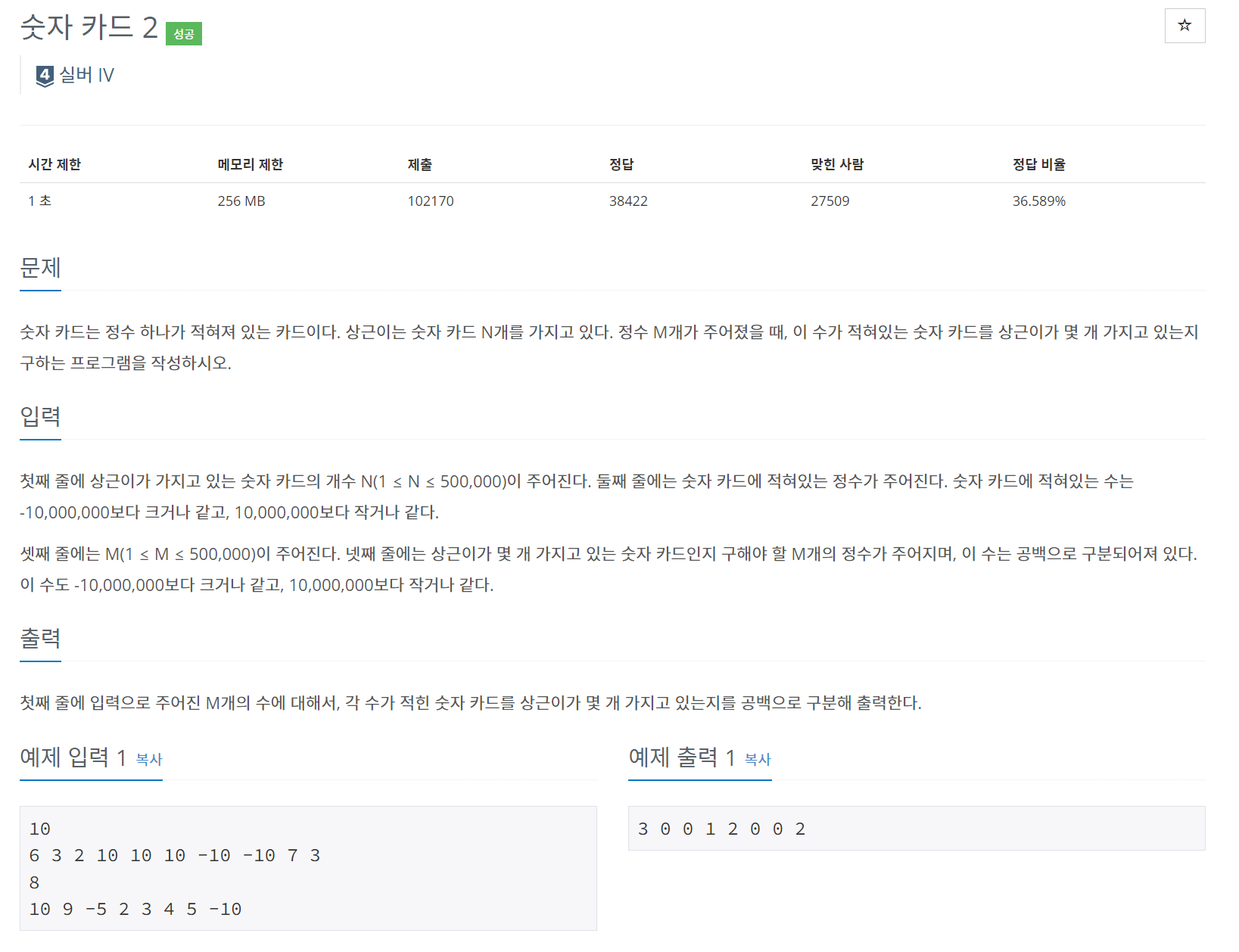https://www.acmicpc.net/problem/10816 10816번: 숫자 카드 2 첫째 줄에 상근이가 가지고 있는 숫자 카드의 개수 N(1 ≤ N ≤ 500,000)이 주어진다. 둘째 줄에는 숫자 카드에 적혀있는 정수가 주어진다. 숫자 카드